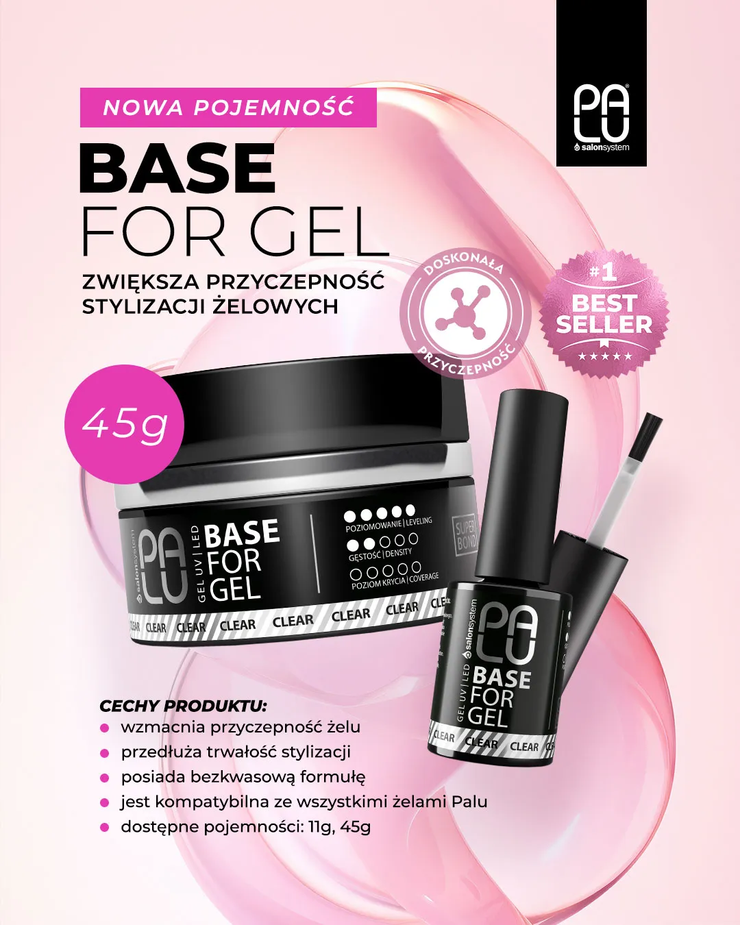 Szukasz sposobu na zwiększenie przyczepności żelu? Chcesz mieć pewność, że Twoje klientki będą cieszyć się stylizacją na dłużej? Base for Gel to bezkwasowa baza o silnych właściwościach gruntujących, której możesz użyć razem z dowolnym żelem Palu. Produkt wpływa na adhezję masy żelowej i chroni gotową stylizację przed odpryskiwaniem i zapowietrzaniem.